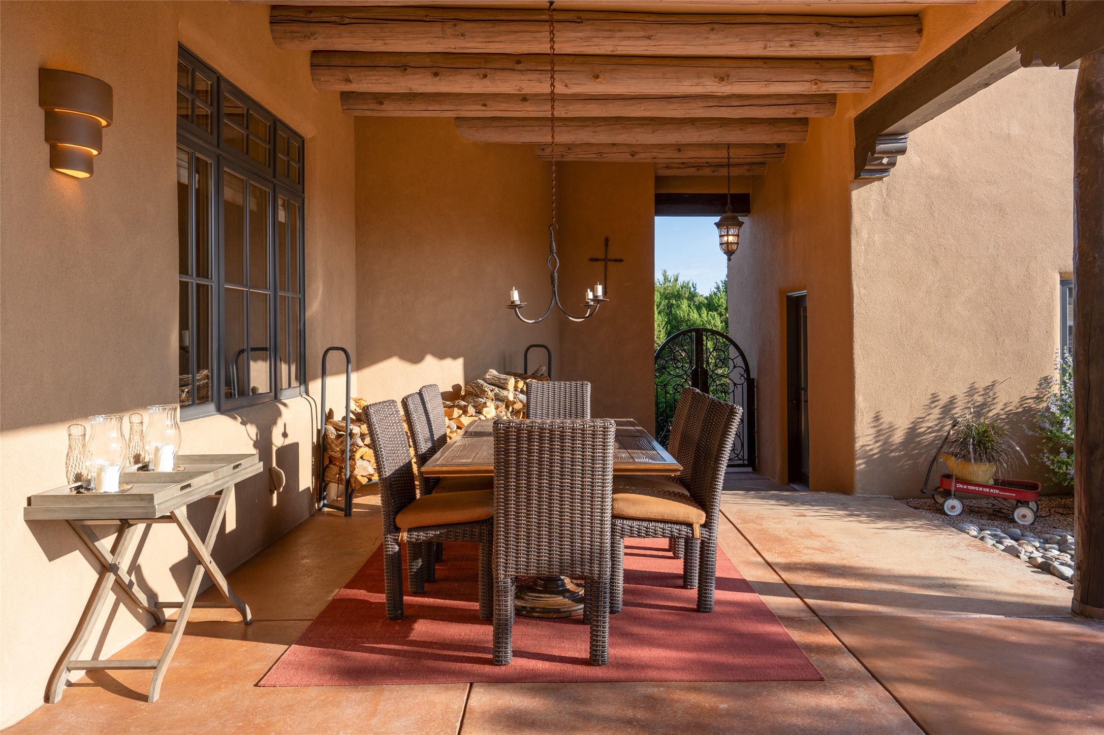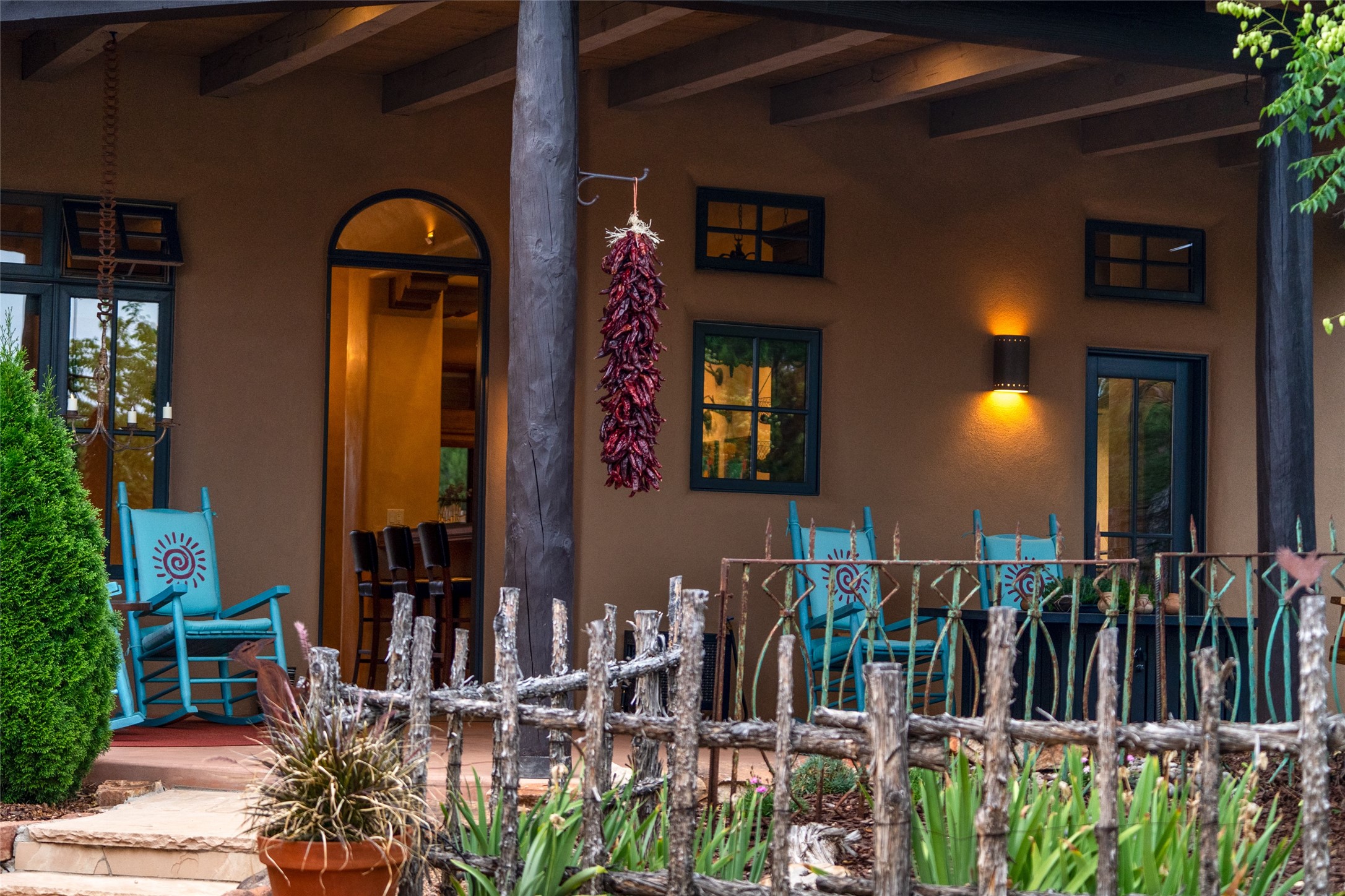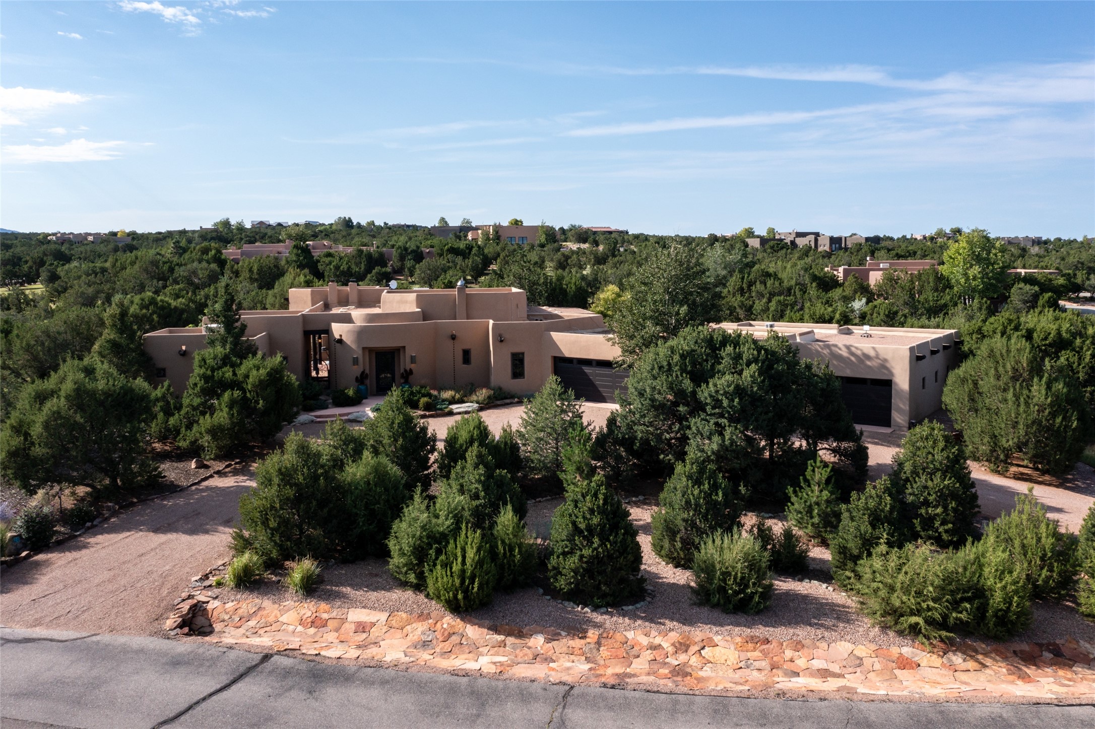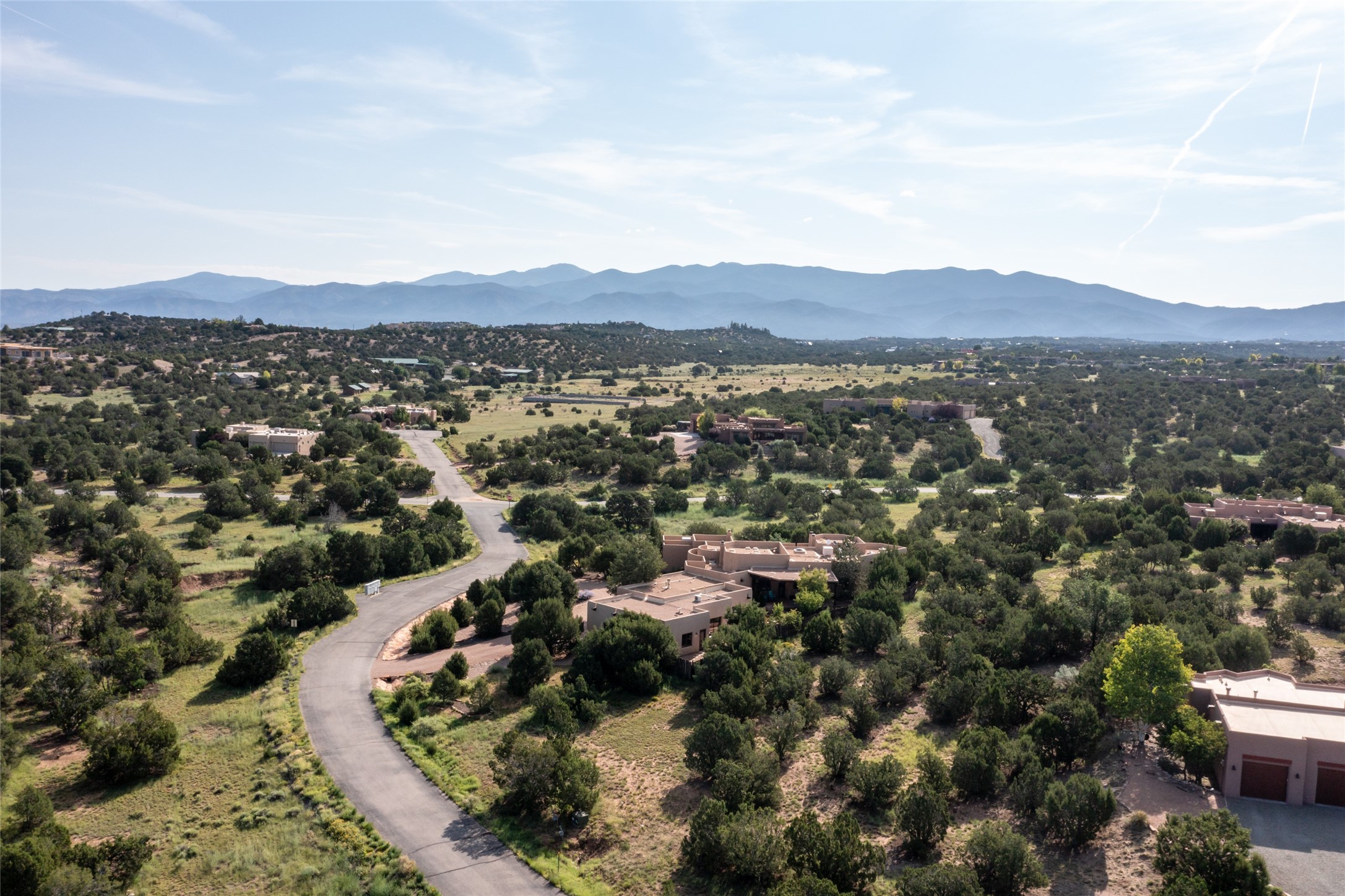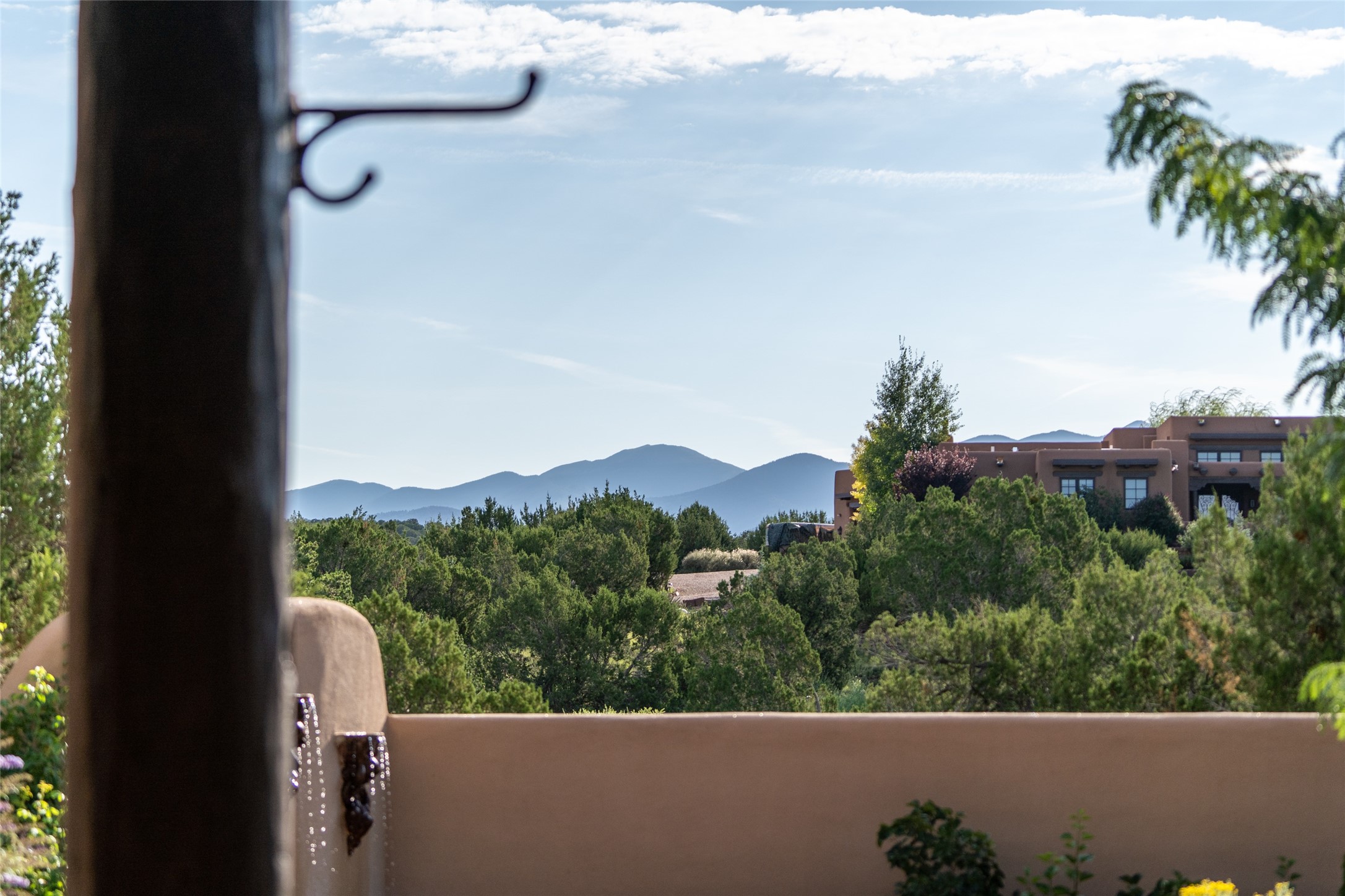 Discover the epitome of elegance and sophistication in this exquisite Sundance Estates single-level property crafted by an award-winning developer. This exceptional home, designed for grand entertaining and effortless living, features two ensuite bedrooms in the primary residence with an additional office. A separate 1-bedroom casita with a private entrance is perfect for guests, while an additional climate-controlled studio offers flex space for arts and crafts or an additional guest room. The heated 4-car garage includes two oversized bays with ample room for a workshop or home gym. Experience views of the Sangre de Cristo Mountains from various vantage points within and outside the home. This property exudes Santa Fe charm with high ceilings, vigas, and dramatic architectural details, all enhanced by luxury finishes throughout. The chef's kitchen is a culinary delight, equipped with high-end appliances designed for both function and style, along with the entertainment/breakfast bar. The separate wet bar in the dining area features a copper sink, wine cooler, and triple-filtered ice maker. The northeast-facing portal offers a serene outdoor living room and dining space, complete with a fireplace, fountain, and mountain views. The southwest-facing portal is connected to the kitchen and provides a perfect place for grilling out in the afternoon shade and enjoying a sunset amidst lush landscaping. The thoughtfully designed floor plan ensures privacy and spaciousness, with perfectly situated bedrooms at different ends of the home, including a primary suite with his and hers walk-in closets. Built with sustainable FASWALL building systems, this home combines environmental responsibility with luxury living. Meticulously maintained and lovingly cared for, this property offers the ultimate blend of sophistication, Santa Fe charm, and modern luxury. Schedule your private tour today and experience the quality and attention to detail this home offers.