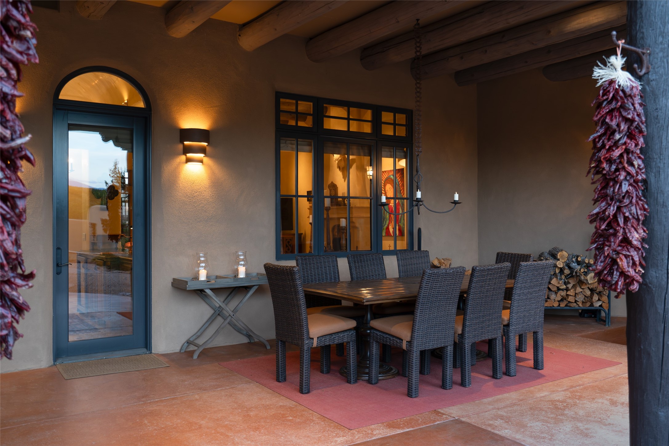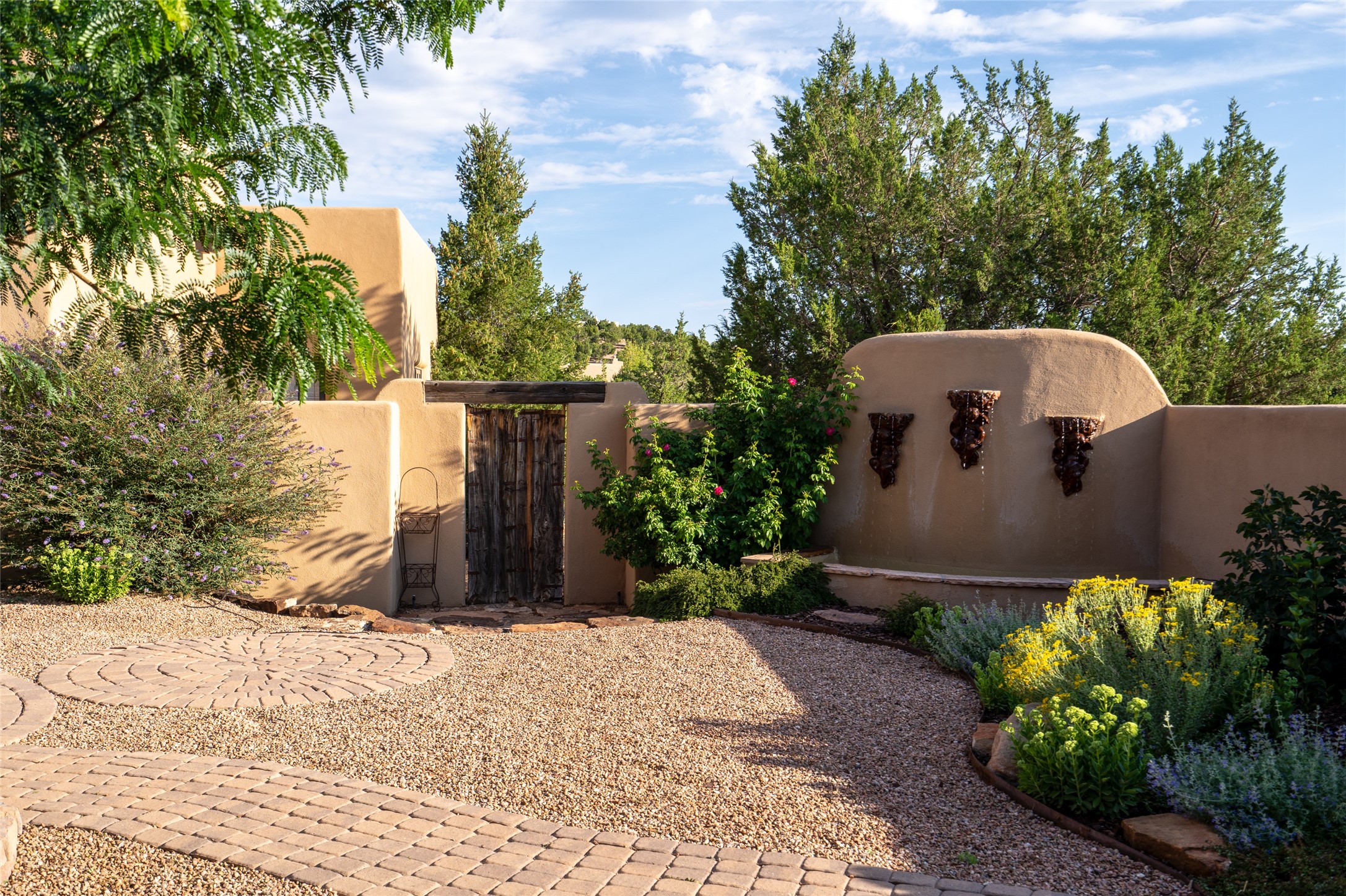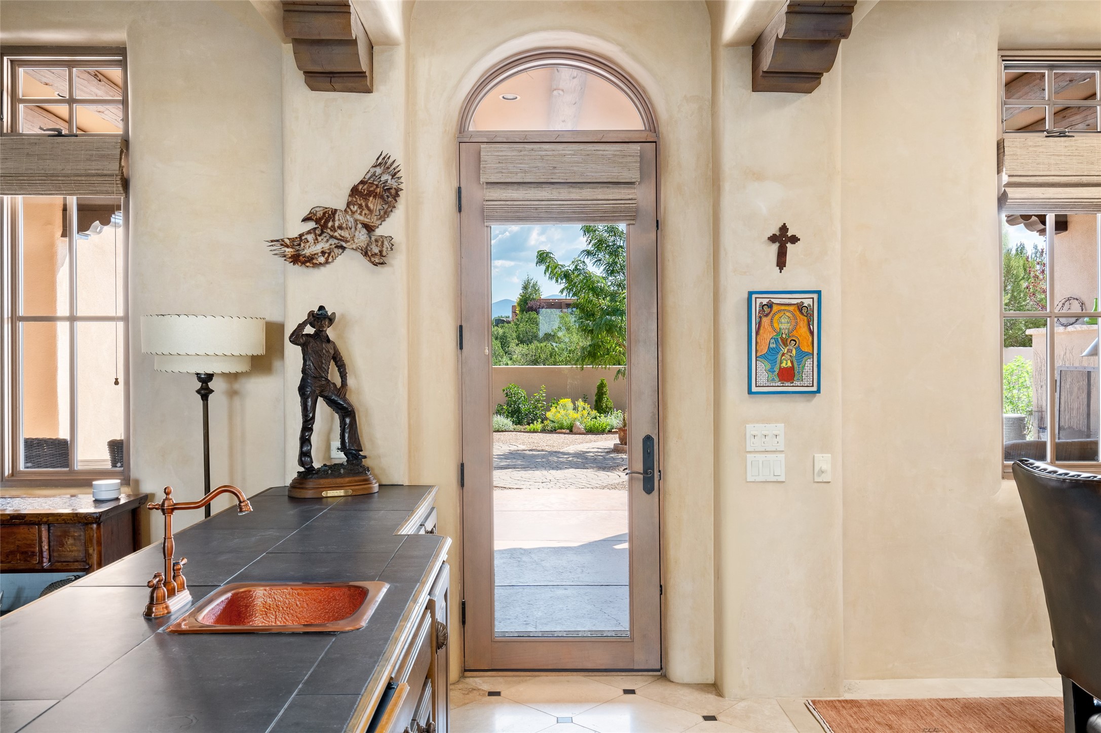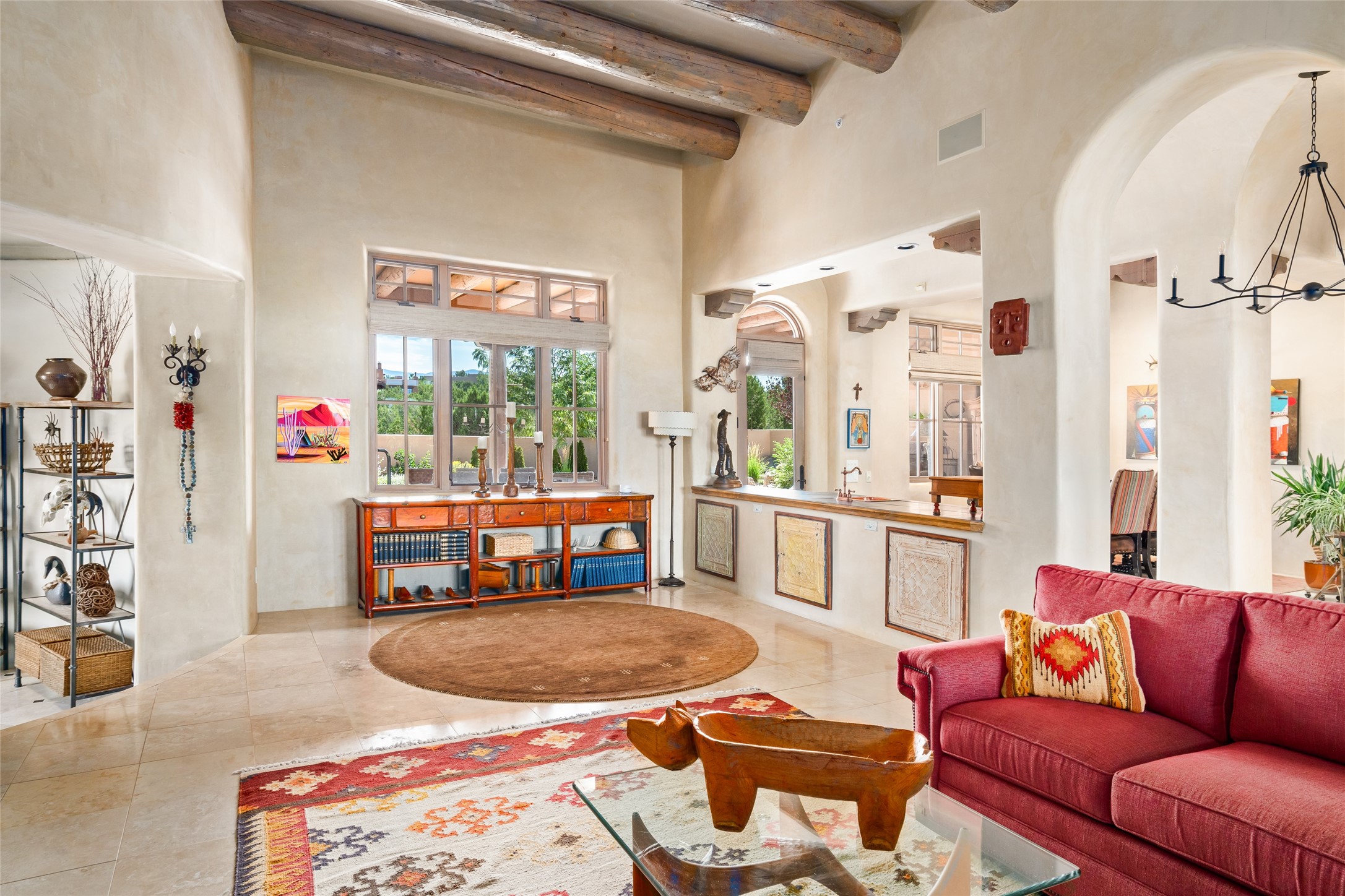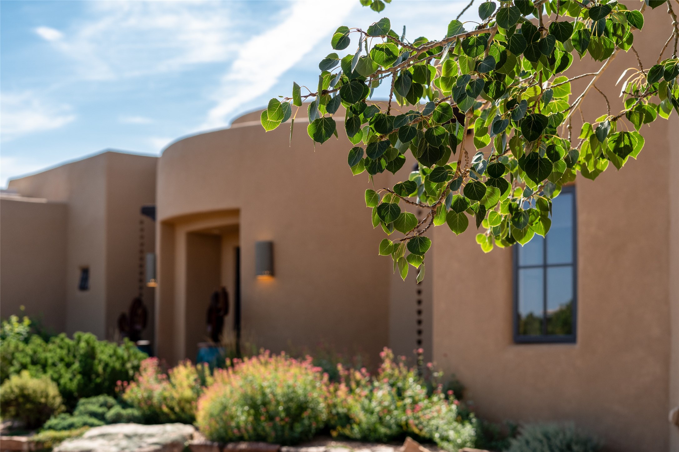 Discover the epitome of elegance and sophistication in this exquisite Sundance Estates single-level property crafted by an award-winning developer. This exceptional home, designed for grand entertaining and effortless living, features two ensuite bedrooms in the primary residence with an additional office. A separate 1-bedroom casita with a private entrance is perfect for guests, while an additional climate-controlled studio offers flex space for arts and crafts or an additional guest room. The heated 4-car garage includes two oversized bays with ample room for a workshop or home gym. Experience views of the Sangre de Cristo Mountains from various vantage points within and outside the home. This property exudes Santa Fe charm with high ceilings, vigas, and dramatic architectural details, all enhanced by luxury finishes throughout. The chef's kitchen is a culinary delight, equipped with high-end appliances designed for both function and style, along with the entertainment/breakfast bar. The separate wet bar in the dining area features a copper sink, wine cooler, and triple-filtered ice maker. The northeast-facing portal offers a serene outdoor living room and dining space, complete with a fireplace, fountain, and mountain views. The southwest-facing portal is connected to the kitchen and provides a perfect place for grilling out in the afternoon shade and enjoying a sunset amidst lush landscaping. The thoughtfully designed floor plan ensures privacy and spaciousness, with perfectly situated bedrooms at different ends of the home, including a primary suite with his and hers walk-in closets. Built with sustainable FASWALL building systems, this home combines environmental responsibility with luxury living. Meticulously maintained and lovingly cared for, this property offers the ultimate blend of sophistication, Santa Fe charm, and modern luxury. Schedule your private tour today and experience the quality and attention to detail this home offers.