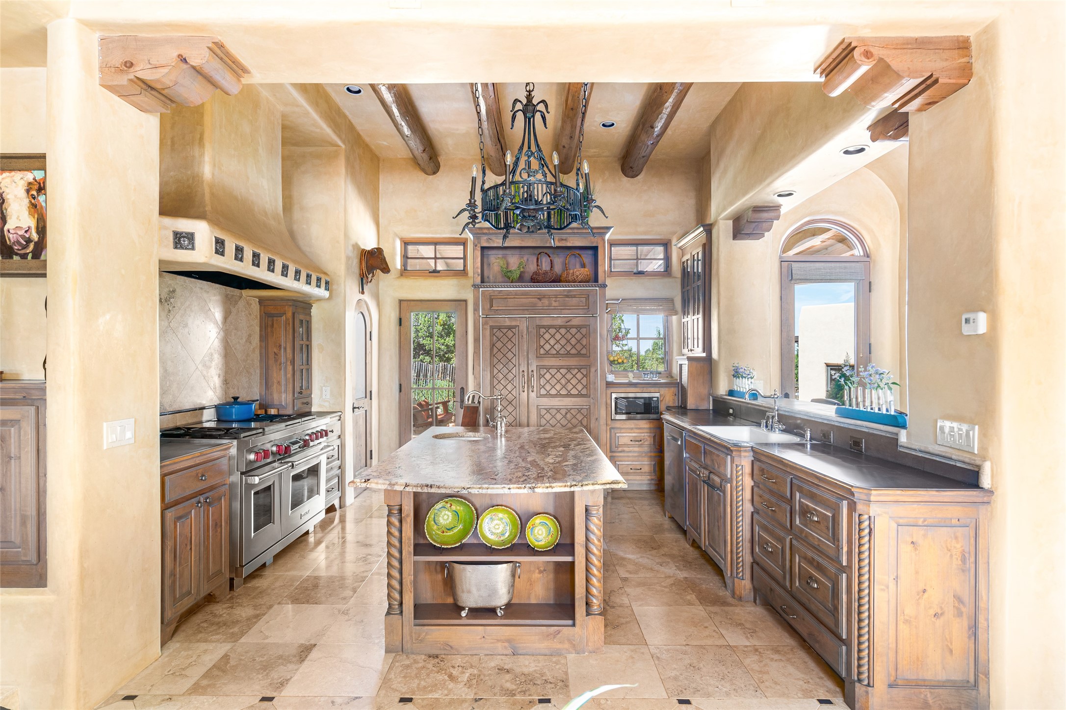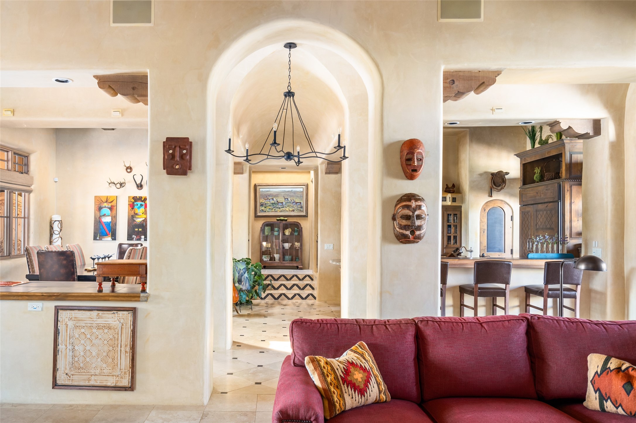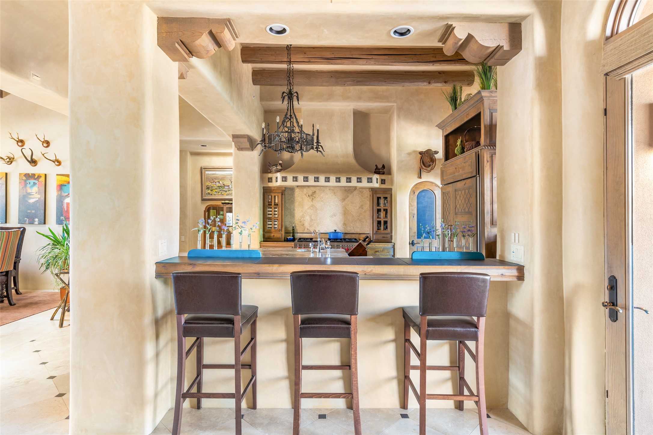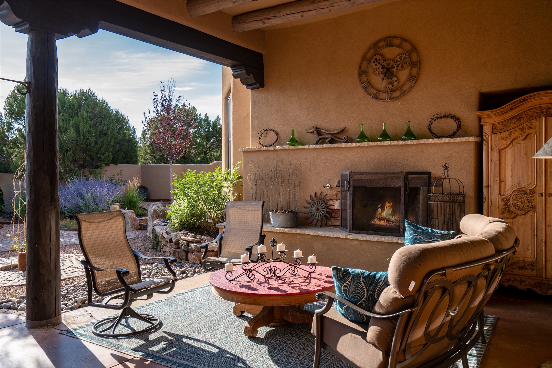 Discover the epitome of elegance and sophistication in this exquisite Sundance Estates single-level property crafted by an award-winning developer. This exceptional home, designed for grand entertaining and effortless living, features two ensuite bedrooms in the primary residence with an additional office. A separate 1-bedroom casita with a private entrance is perfect for guests, while an additional climate-controlled studio offers flex space for arts and crafts or an additional guest room. The heated 4-car garage includes two oversized bays with ample room for a workshop or home gym. Experience views of the Sangre de Cristo Mountains from various vantage points within and outside the home. This property exudes Santa Fe charm with high ceilings, vigas, and dramatic architectural details, all enhanced by luxury finishes throughout. The chef's kitchen is a culinary delight, equipped with high-end appliances designed for both function and style, along with the entertainment/breakfast bar. The separate wet bar in the dining area features a copper sink, wine cooler, and triple-filtered ice maker. The northeast-facing portal offers a serene outdoor living room and dining space, complete with a fireplace, fountain, and mountain views. The southwest-facing portal is connected to the kitchen and provides a perfect place for grilling out in the afternoon shade and enjoying a sunset amidst lush landscaping. The thoughtfully designed floor plan ensures privacy and spaciousness, with perfectly situated bedrooms at different ends of the home, including a primary suite with his and hers walk-in closets. Built with sustainable FASWALL building systems, this home combines environmental responsibility with luxury living. Meticulously maintained and lovingly cared for, this property offers the ultimate blend of sophistication, Santa Fe charm, and modern luxury. Schedule your private tour today and experience the quality and attention to detail this home offers.