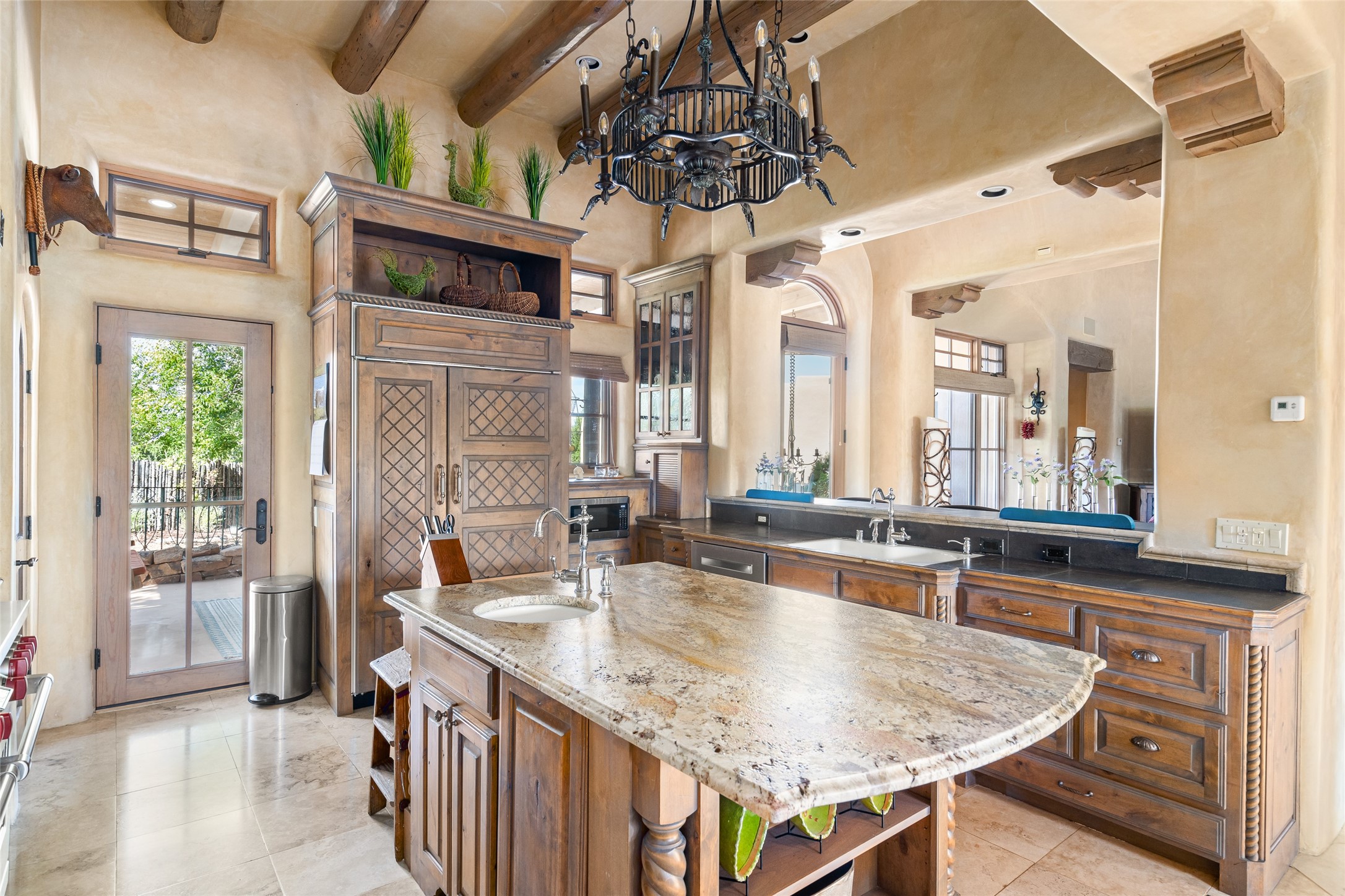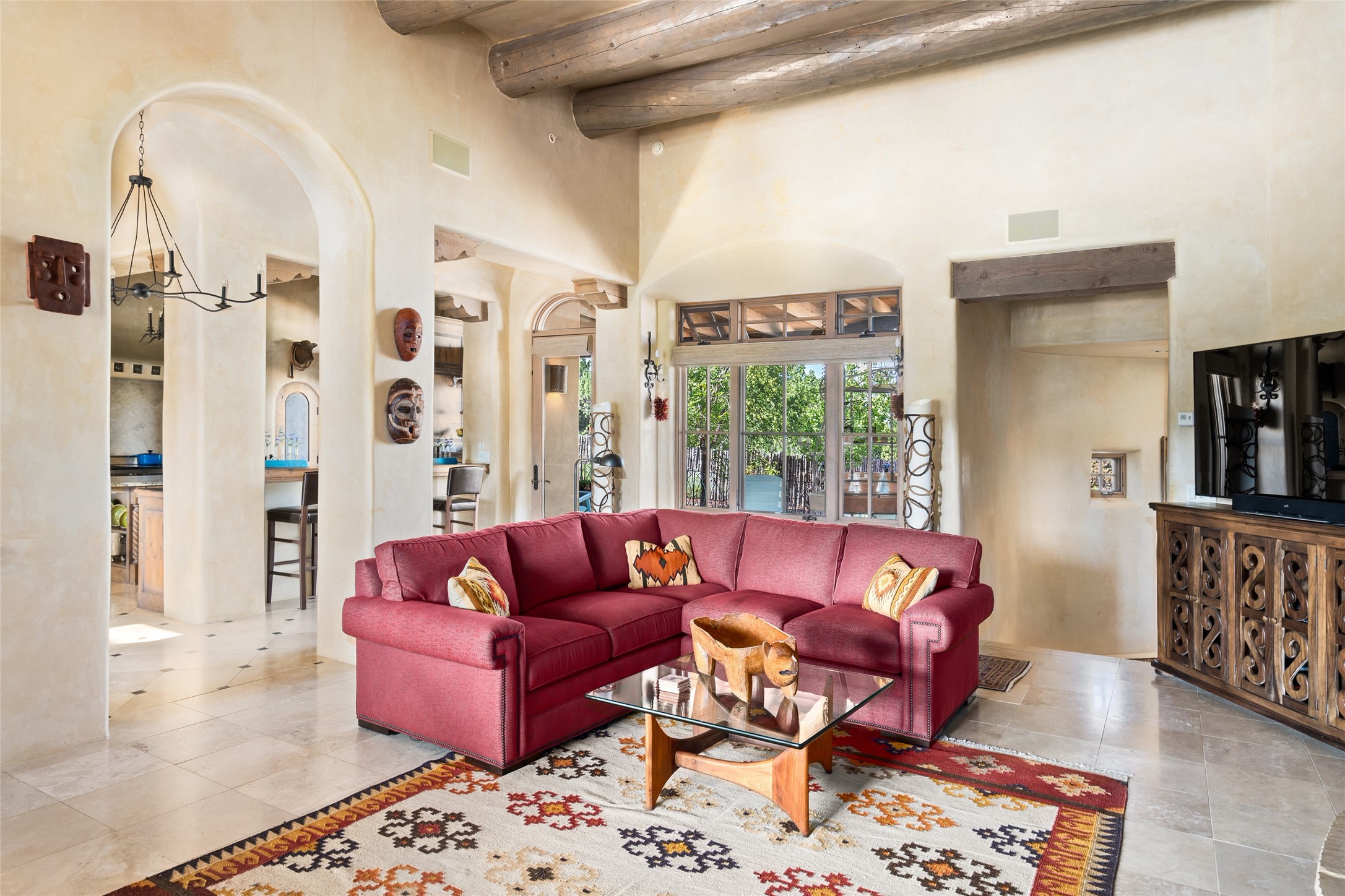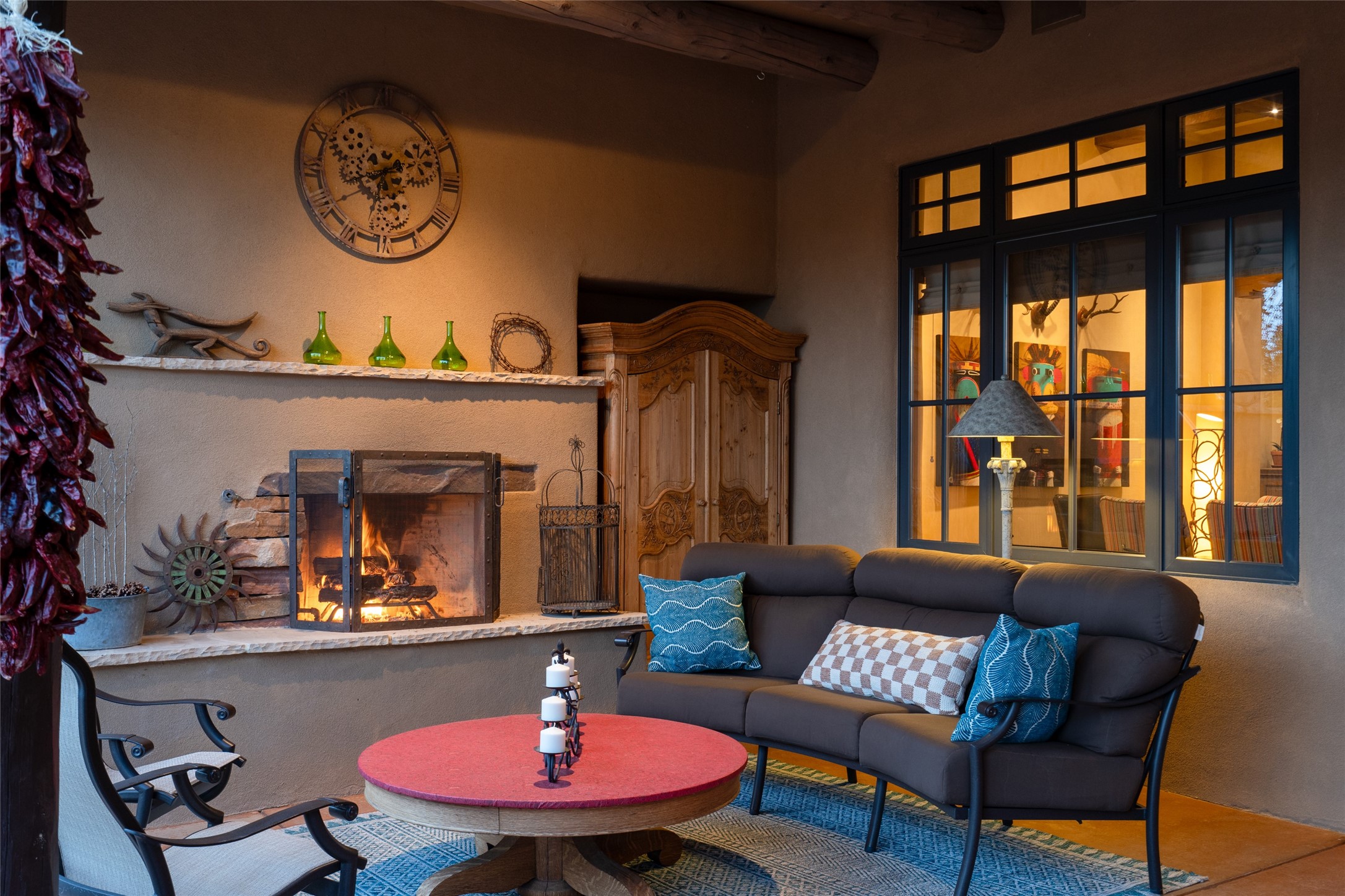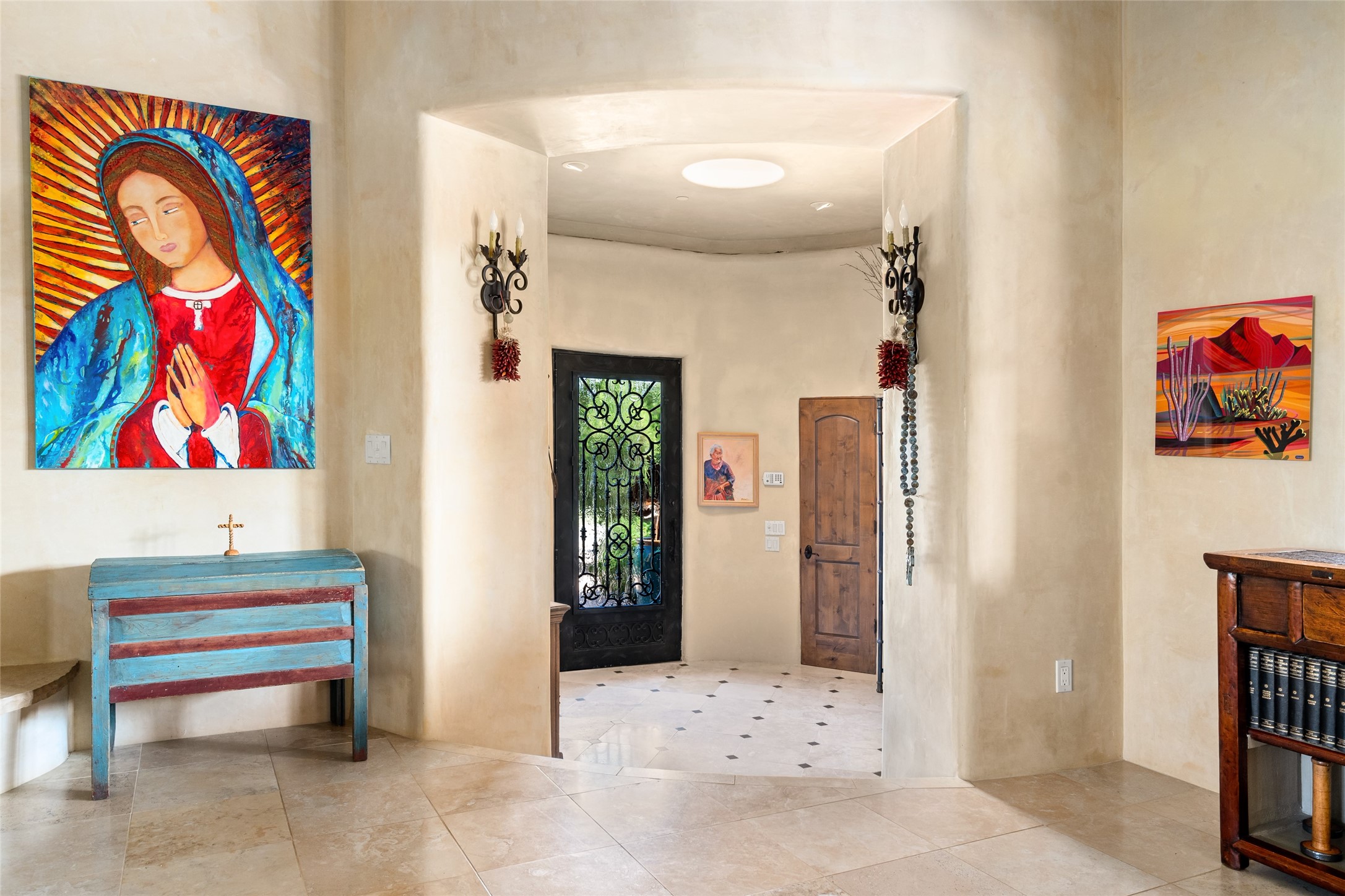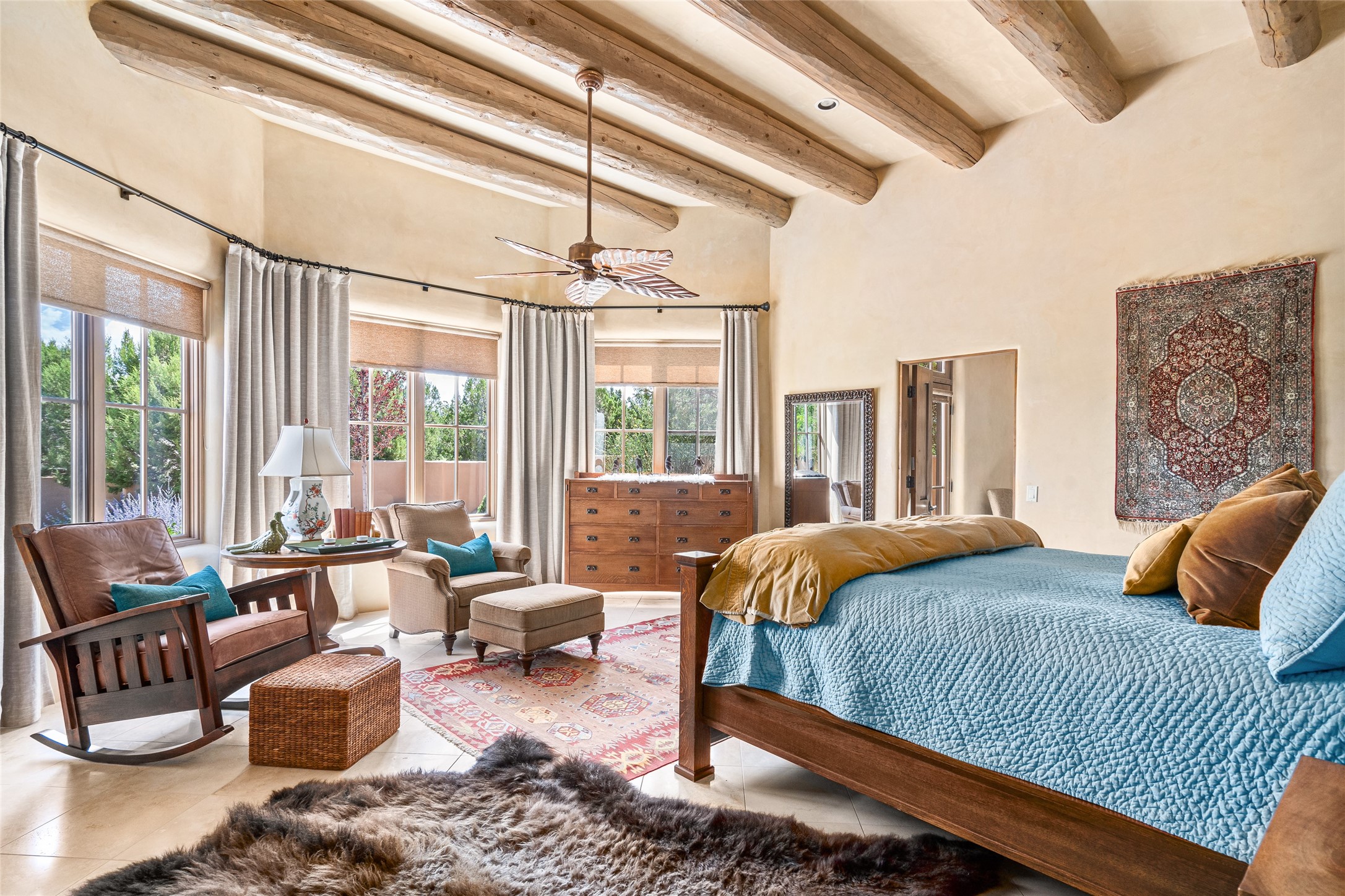 Discover the epitome of elegance and sophistication in this exquisite Sundance Estates single-level property crafted by an award-winning developer. This exceptional home, designed for grand entertaining and effortless living, features two ensuite bedrooms in the primary residence with an additional office. A separate 1-bedroom casita with a private entrance is perfect for guests, while an additional climate-controlled studio offers flex space for arts and crafts or an additional guest room. The heated 4-car garage includes two oversized bays with ample room for a workshop or home gym. Experience views of the Sangre de Cristo Mountains from various vantage points within and outside the home. This property exudes Santa Fe charm with high ceilings, vigas, and dramatic architectural details, all enhanced by luxury finishes throughout. The chef's kitchen is a culinary delight, equipped with high-end appliances designed for both function and style, along with the entertainment/breakfast bar. The separate wet bar in the dining area features a copper sink, wine cooler, and triple-filtered ice maker. The northeast-facing portal offers a serene outdoor living room and dining space, complete with a fireplace, fountain, and mountain views. The southwest-facing portal is connected to the kitchen and provides a perfect place for grilling out in the afternoon shade and enjoying a sunset amidst lush landscaping. The thoughtfully designed floor plan ensures privacy and spaciousness, with perfectly situated bedrooms at different ends of the home, including a primary suite with his and hers walk-in closets. Built with sustainable FASWALL building systems, this home combines environmental responsibility with luxury living. Meticulously maintained and lovingly cared for, this property offers the ultimate blend of sophistication, Santa Fe charm, and modern luxury. Schedule your private tour today and experience the quality and attention to detail this home offers.