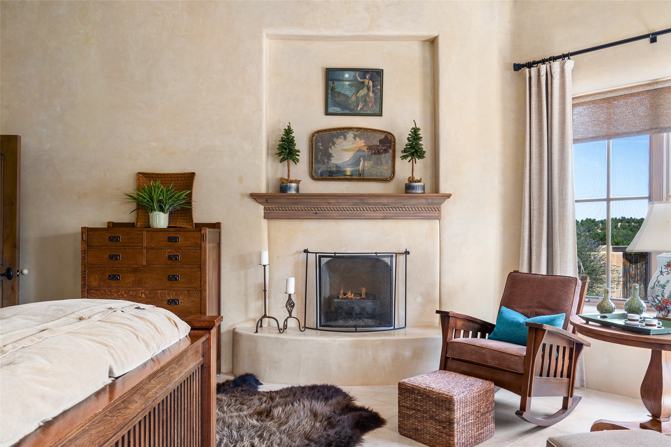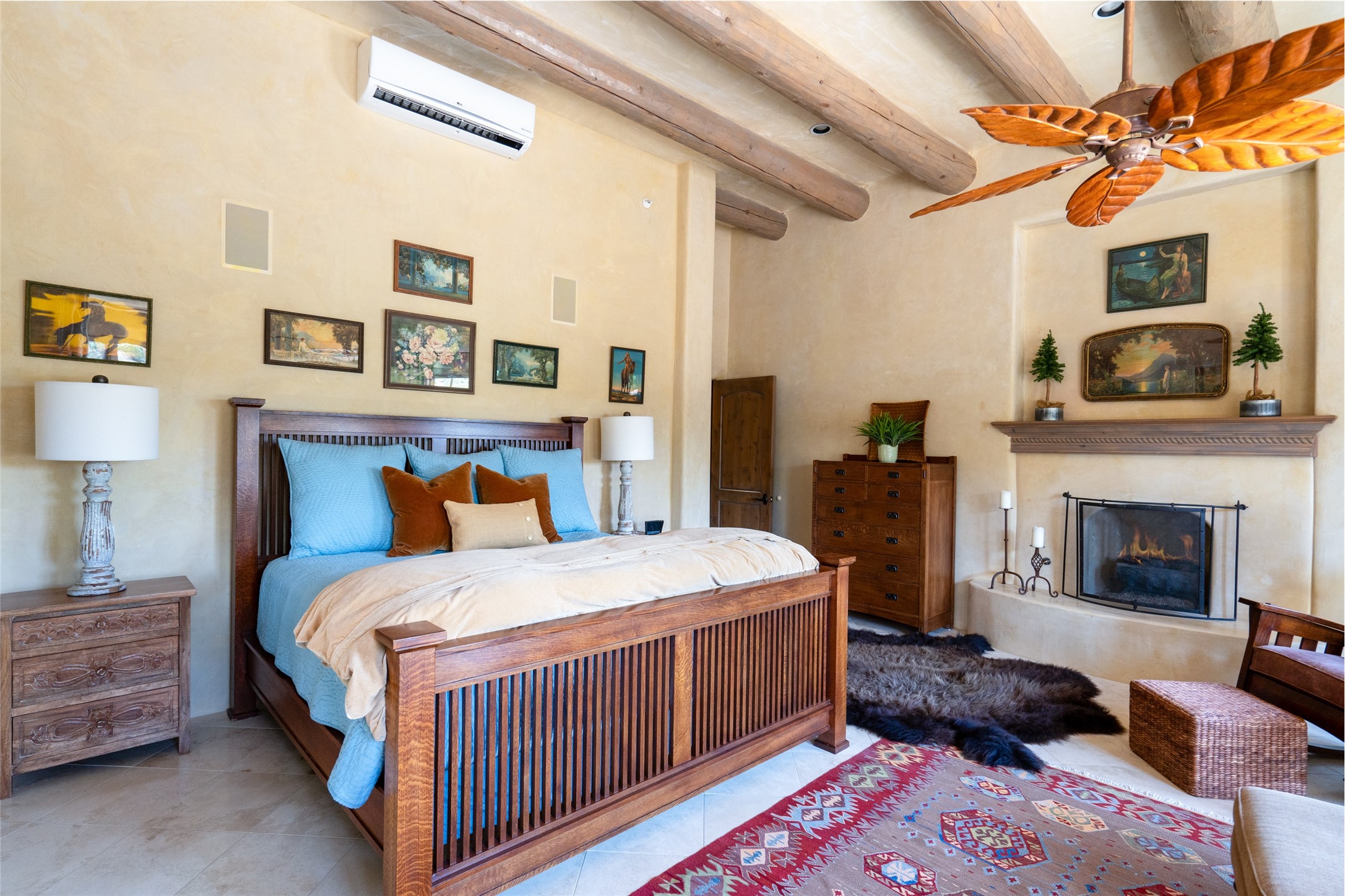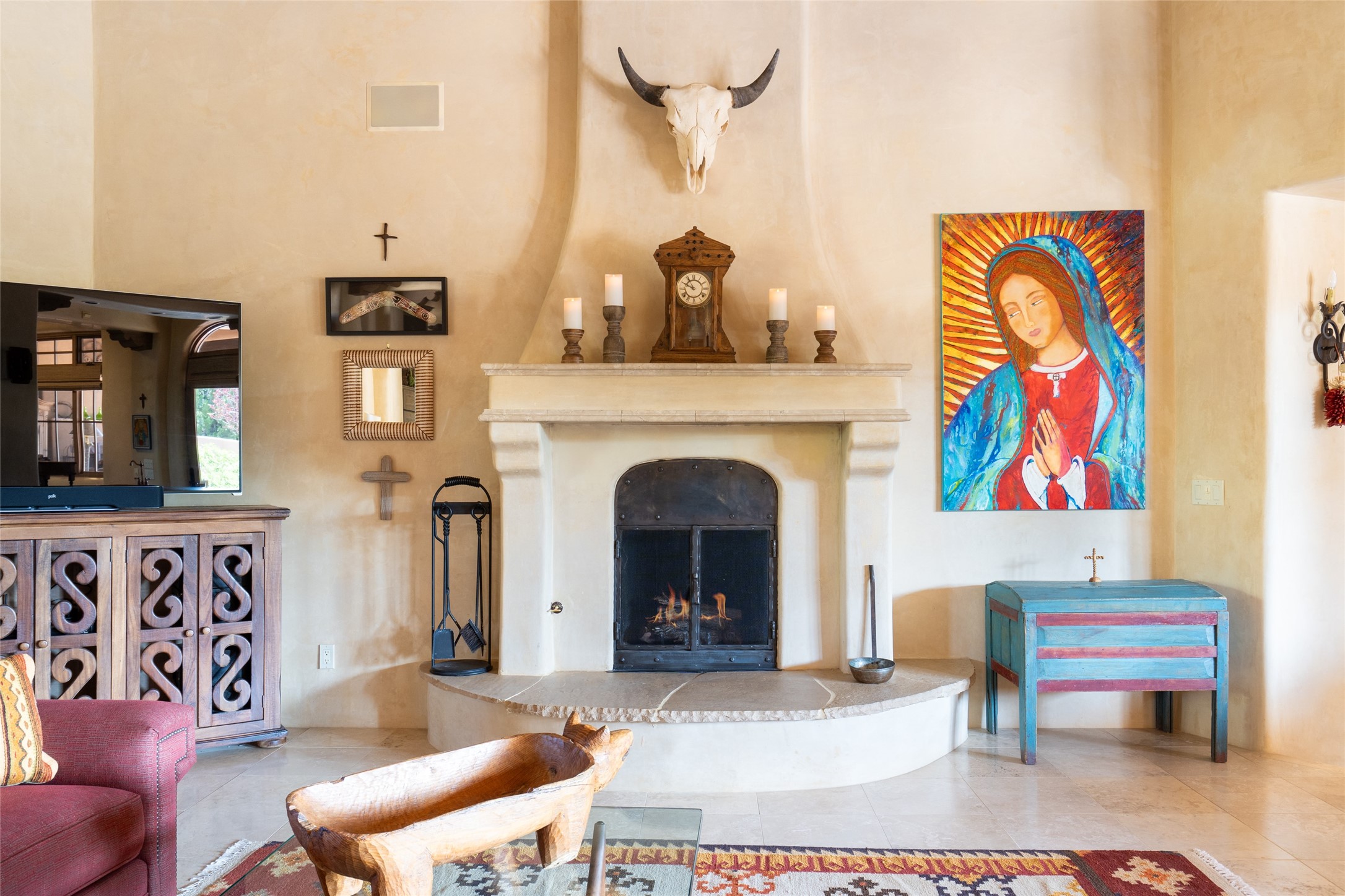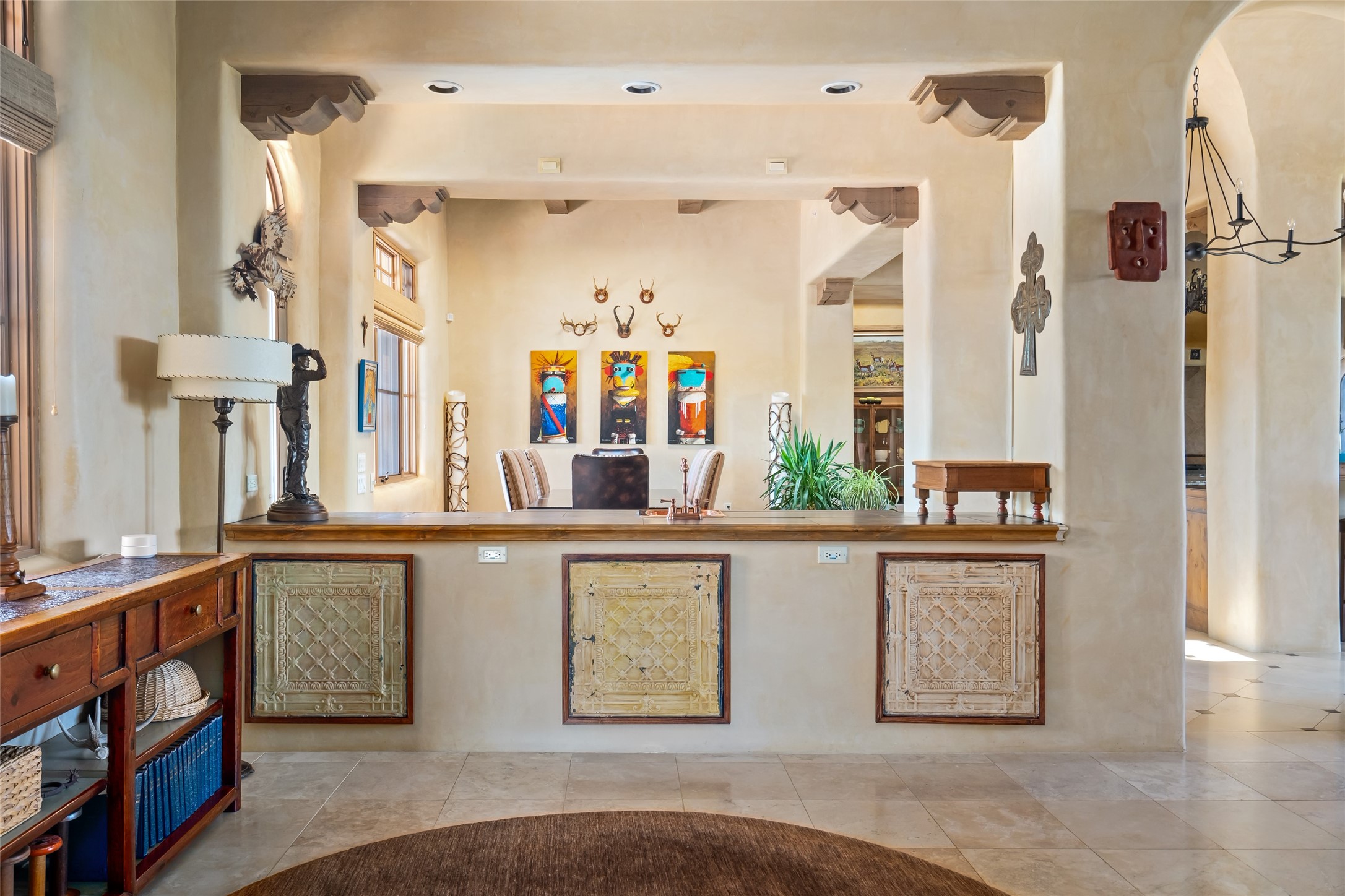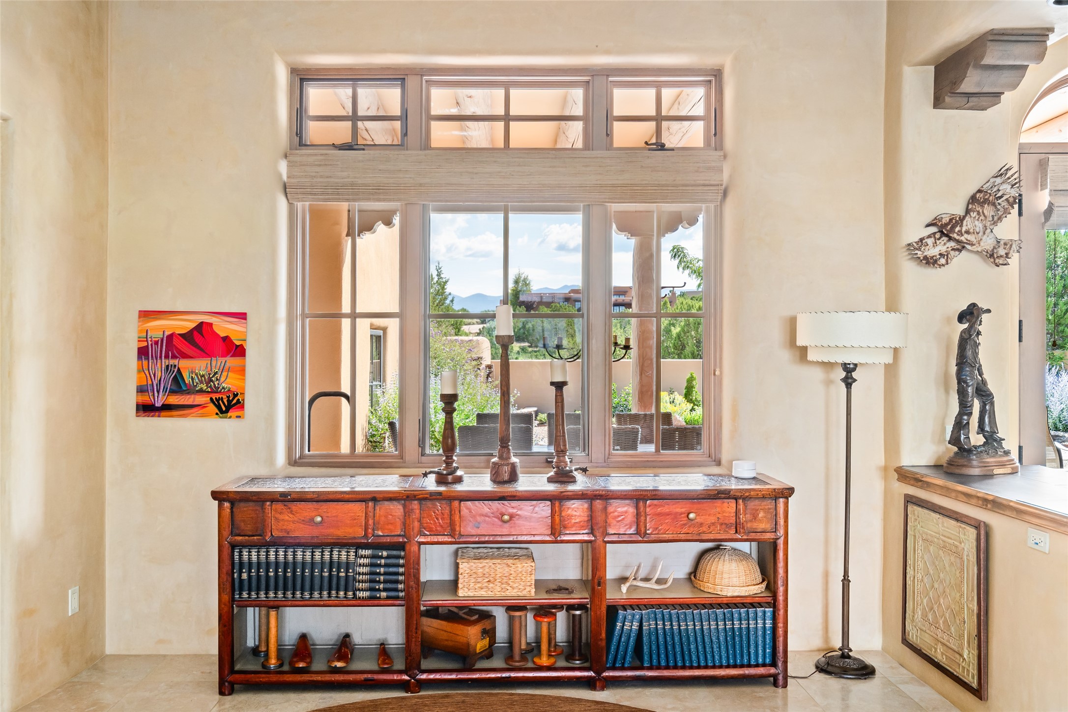 Discover the epitome of elegance and sophistication in this exquisite Sundance Estates single-level property crafted by an award-winning developer. This exceptional home, designed for grand entertaining and effortless living, features two ensuite bedrooms in the primary residence with an additional office. A separate 1-bedroom casita with a private entrance is perfect for guests, while an additional climate-controlled studio offers flex space for arts and crafts or an additional guest room. The heated 4-car garage includes two oversized bays with ample room for a workshop or home gym. Experience views of the Sangre de Cristo Mountains from various vantage points within and outside the home. This property exudes Santa Fe charm with high ceilings, vigas, and dramatic architectural details, all enhanced by luxury finishes throughout. The chef's kitchen is a culinary delight, equipped with high-end appliances designed for both function and style, along with the entertainment/breakfast bar. The separate wet bar in the dining area features a copper sink, wine cooler, and triple-filtered ice maker. The northeast-facing portal offers a serene outdoor living room and dining space, complete with a fireplace, fountain, and mountain views. The southwest-facing portal is connected to the kitchen and provides a perfect place for grilling out in the afternoon shade and enjoying a sunset amidst lush landscaping. The thoughtfully designed floor plan ensures privacy and spaciousness, with perfectly situated bedrooms at different ends of the home, including a primary suite with his and hers walk-in closets. Built with sustainable FASWALL building systems, this home combines environmental responsibility with luxury living. Meticulously maintained and lovingly cared for, this property offers the ultimate blend of sophistication, Santa Fe charm, and modern luxury. Schedule your private tour today and experience the quality and attention to detail this home offers.